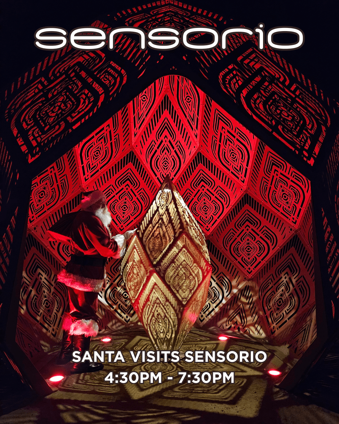 Join us for festive evenings filled with holiday cheer on December 18, 22, and 23. Capture a special moment with Santa amid the glowing lights and enjoy the wonder of the season at Sensorio.