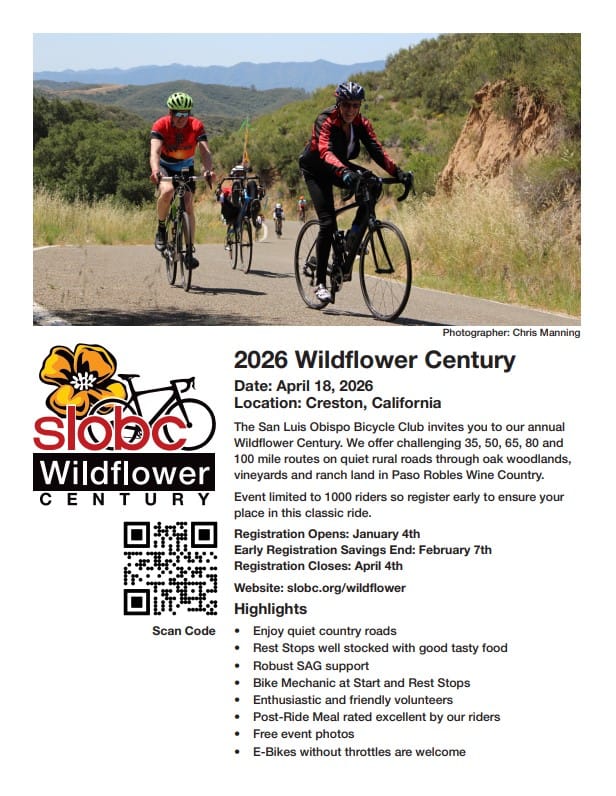 The San Luis Obispo Bicycle Club presents our annual Wildflower Century. We offer challenging 35, 50, 65, 80 and 100 mile routes on quiet rural roads through oak woodlands, vineyards and ranch land in Paso Robles Wine Country. The event is limited to 1000 riders so register early to ensure your place in this classic ride.