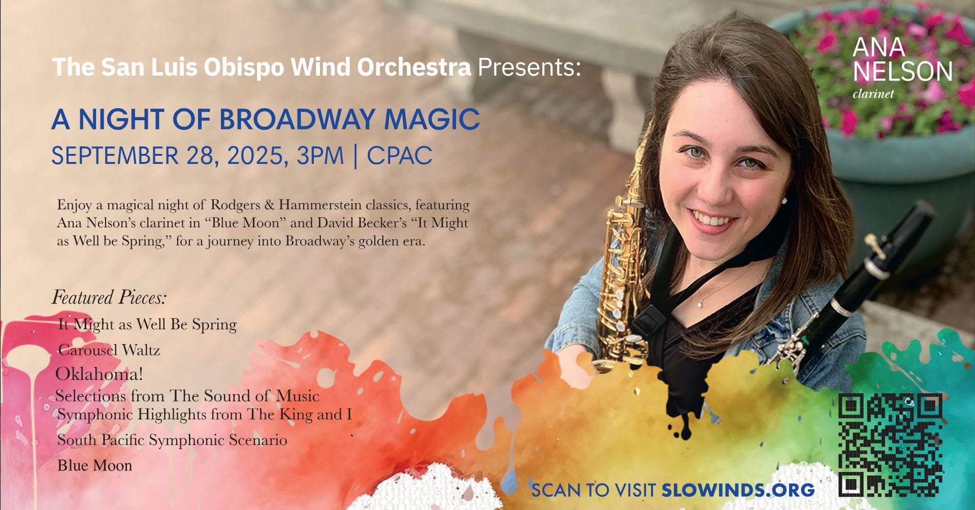 Join the San Luis Obispo Wind Orchestra for an enchanting afternoon of live music at their concert, A Night of Broadway Magic! This captivating performance will feature timeless Broadway melodies, showcasing the extraordinary clarinetist Ana Nelson. The program includes beloved classics such as It Might as Well Be Spring, Carousel Waltz, Oklahoma!, selections from The Sound of Music, Symphonic Highlights from The King and I, South Pacific Symphonic Scenario, Blue Moon, and more.