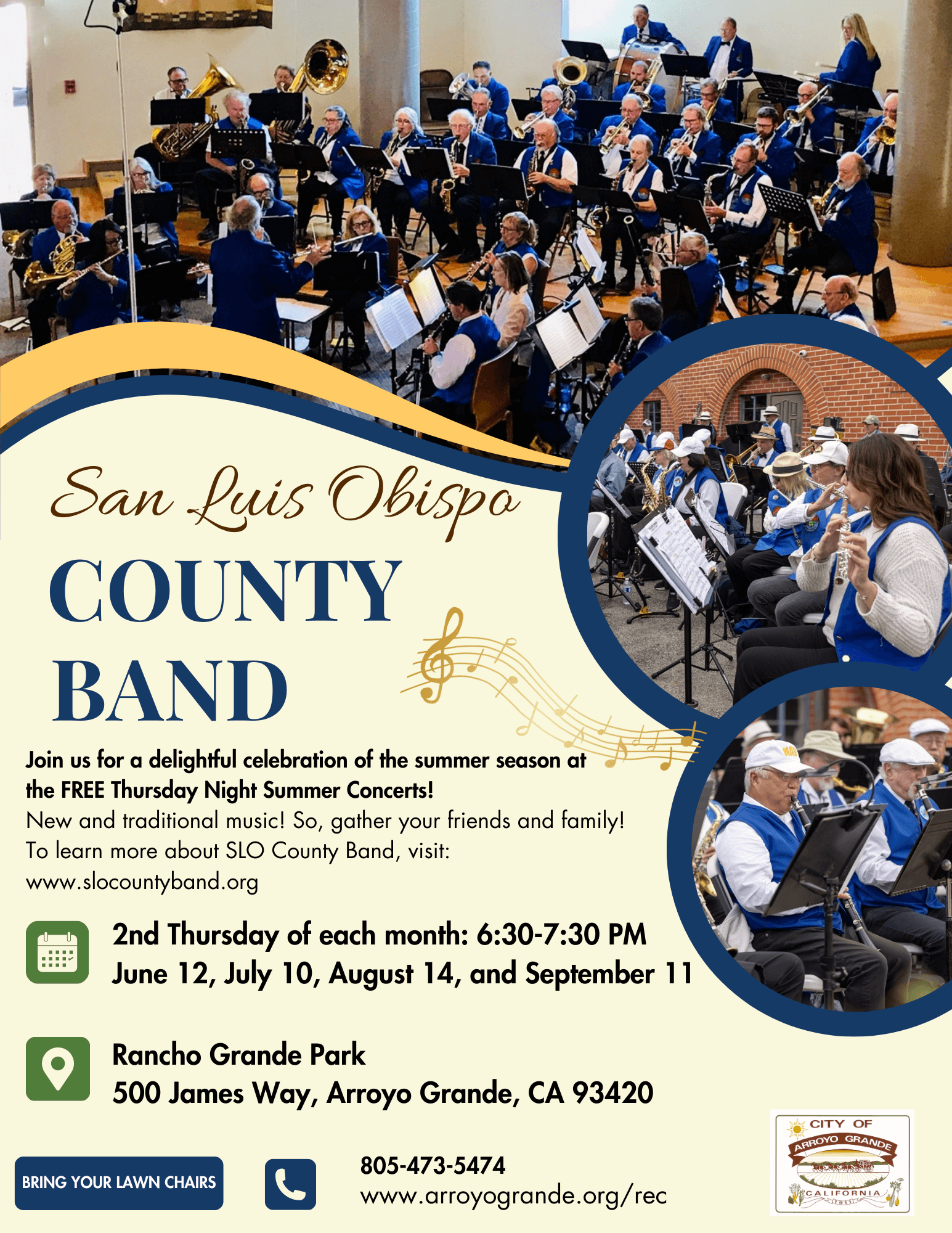Come join the historic San Luis Obispo County band on the 2nd Thursday of each month from June through September at Rancho Grande Park from 6:30-7:30 while they play an array of classic and current songs, movie themes and more!