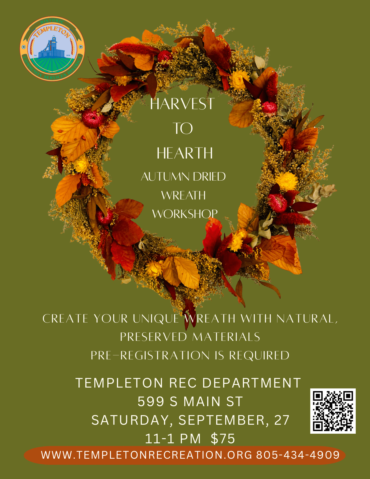 Embrace the beautiful, rich colors of fall with handmade elegance! Create your own, unique autumn wreath! No experience required and all materials included. You have a selection of dried and preserved foliage and floral to choose from as well as seasonal textures and ribbons and light refreshments. Space is limited and pre-registration is required.