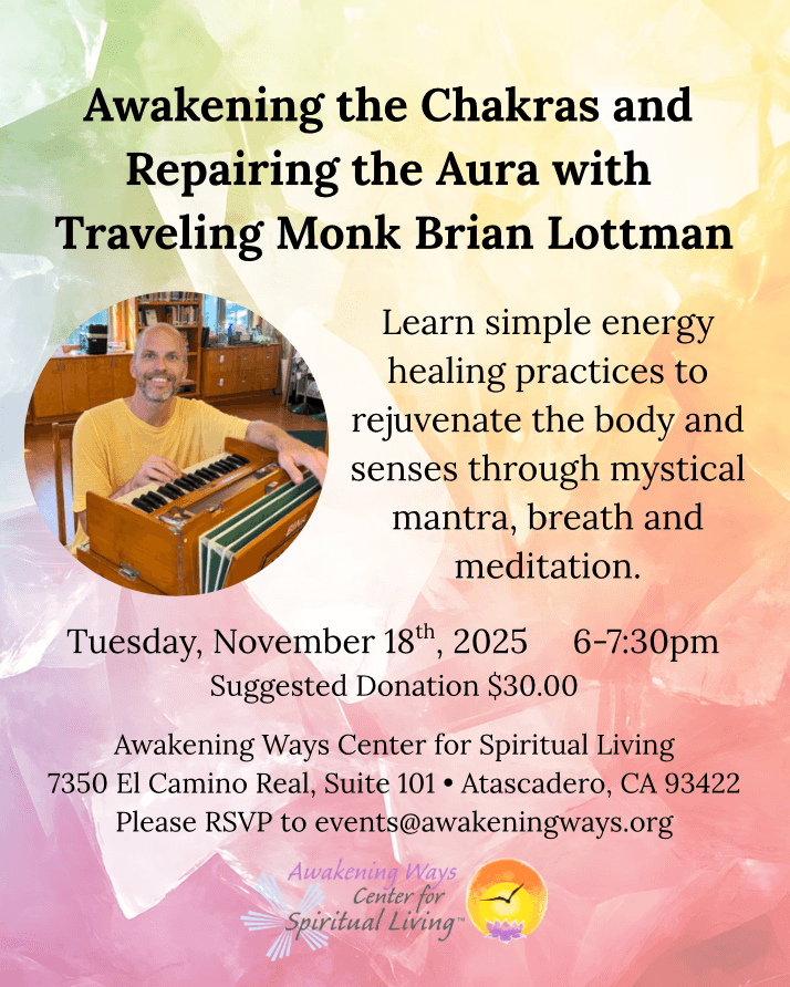 Join us for a transformative evening with Brian Lottman, a traveling monk who has led hundreds of spiritual gatherings across the U.S. and Canada. Through mystical mantra, sacred breath, and guided meditation, Brian invites you to awaken the chakras, repair the aura, and experience deep spiritual rejuvenation.