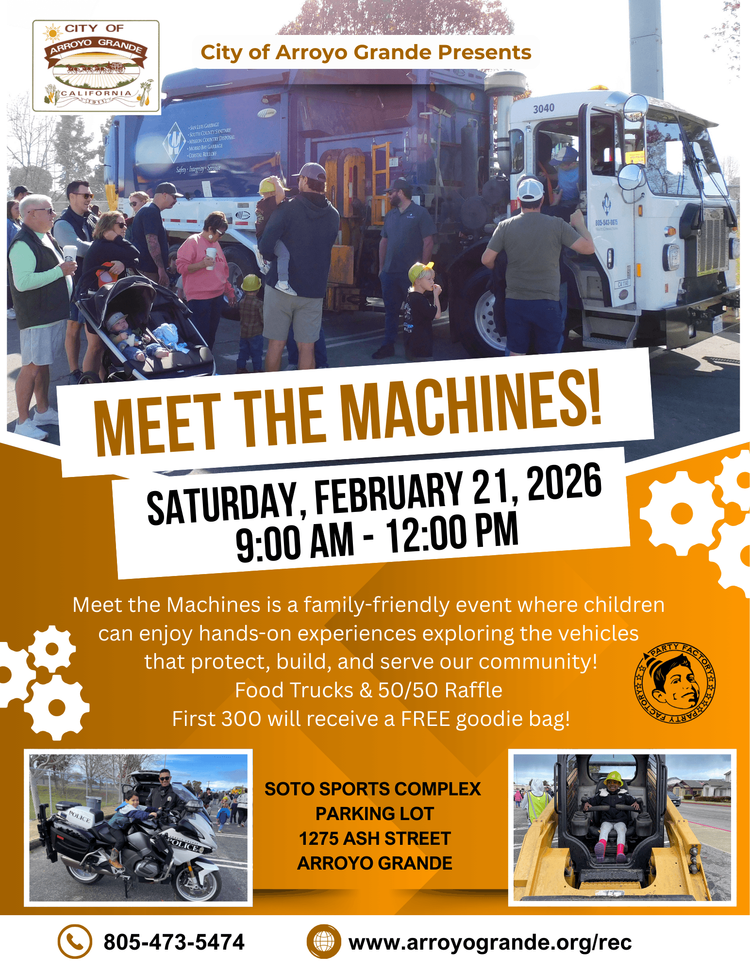The 5th annual free Meet the Machines is on February 21st, 2026, from 9 am to 12 noon at the Soto Sports Field Parking Lot. Children have the opportunity to check out and learn from dozens of machines that make our community run! The first 300 kids get a free goody bag! Don't miss the fun!