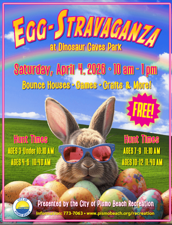 Hop on over to the City of Pismo Beach EGG-STRAVAGANZA on Saturday, April 4, 2026 from 10 AM to 1 PM at Dinosaur Caves Park.