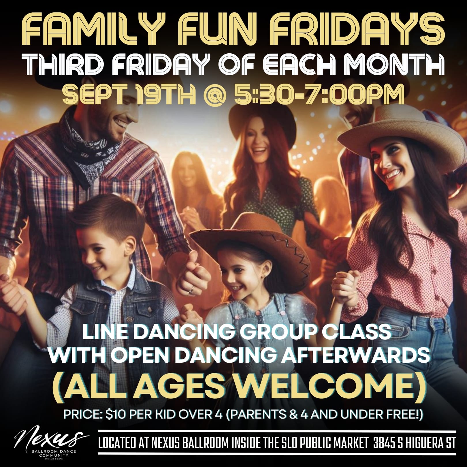 A Family Friendly Line Dance Class including the most popular line dances for all ages. Meant to be danced together as a family. 45-minute class and open dance time afterward!