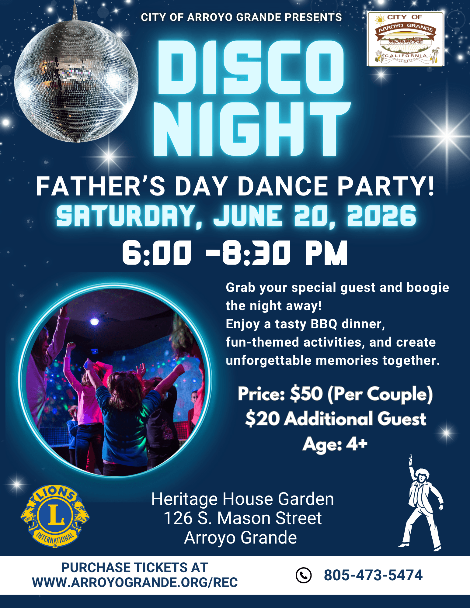 Celebrate dad at the annual Father's Day Dance! A live DJ spinning disco tunes will have you dancing the night away as you enjoy dinner from the Arroyo Grande Lion's Club, crafts, photo ops and other activities! $50 per couple, $20 each additional guest. Register soon before this event sells out!