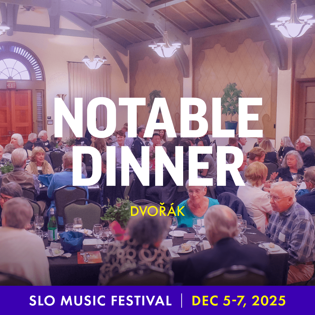 Join Scott Yoo and the Festival artists for an interactive musical exploration of Dvořák's Piano Quartet. Throughout the evening you will learn about the composer, hear performances of some selections, and gain insight into the piece. The evening will conclude with a gourmet three-course dinner complete with award-winning Central Coast wines. The event begins with wine and passed appetizers in the foyer at 3:00 PM. The Notable Encounter presentation will begin at 4:00 PM, followed by a three-course dinner at 5:00 PM.
