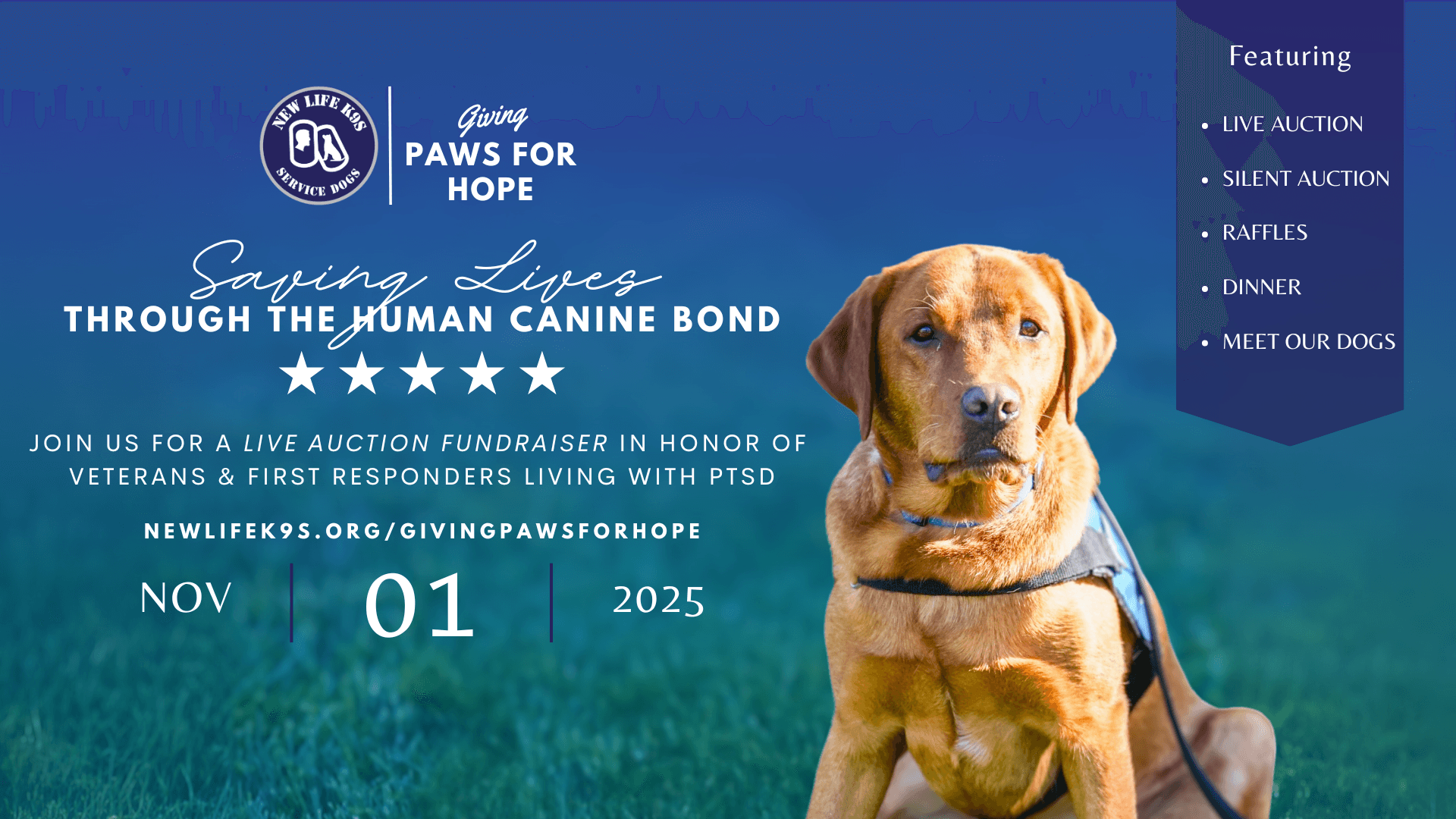 We’re excited to celebrate the third year of our cherished Giving Paws for Hope Fundraising Dinner—a special evening dedicated to raising vital funds to provide life-saving service dogs, free of charge, to veterans and first responders living with PTSD. Together, we’re changing lives, one paw at a time.