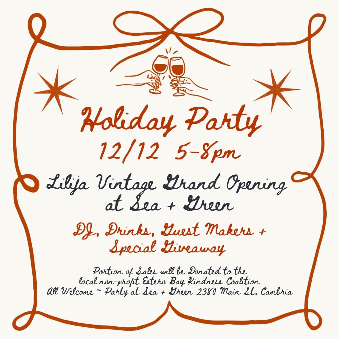 Join us for the Grand Opening of Lilija Shop, a permanent pop up inside our shop, full of carefully curated vintage and independent designer clothing and goods. We will also be celebrating this night as our annual Holiday Party with some funky DJ tunes, small bites and a portion of our the proceeds will be donated to Estero Bay Kindness Coalition. There will be special guest artists and makers as well.
