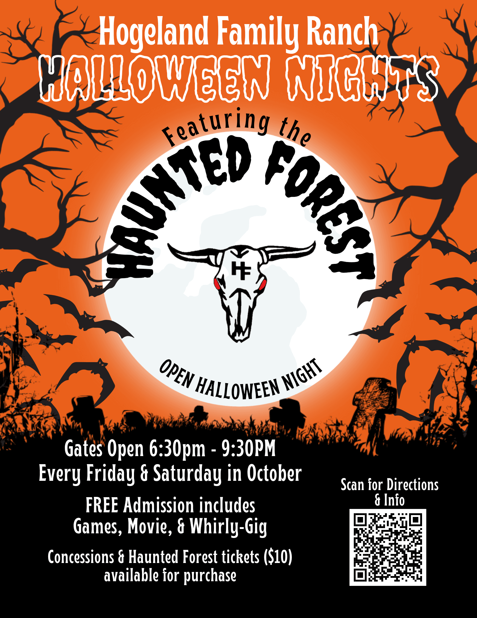 Our annual Haunted Forest walk is back at The Hogeland Family Ranch! Come enjoy the complimentary games, movie, and whirly-gig. Then jump on the wagon and take a ride down to the Haunted Forest ($10 admission) for a spooky walk through the trees.