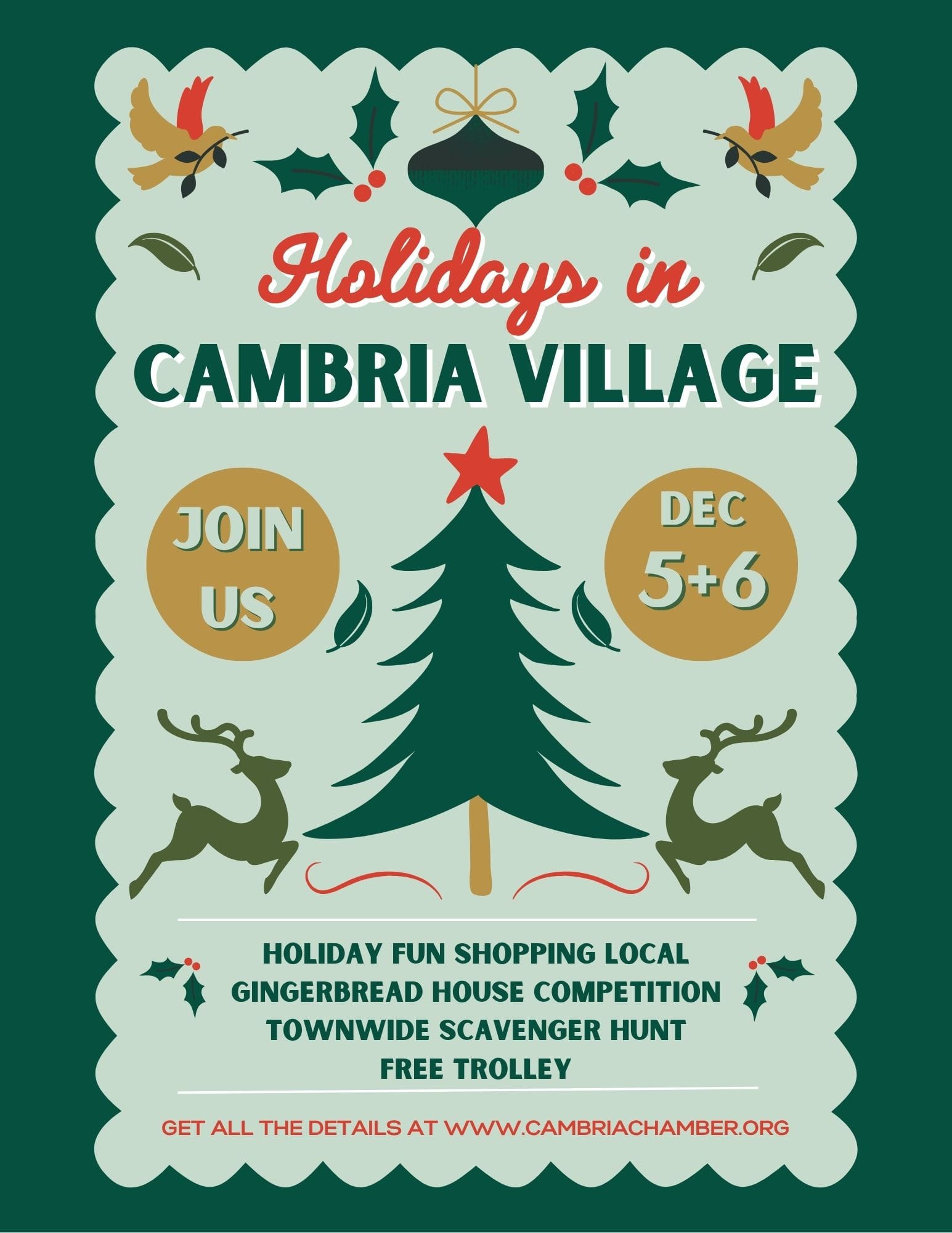 Join us for our 2nd Annual Holidays in Cambria Village which kicks off with a Hospitality Night on Main Street Thursday 12/4 4-7pm. There will be fun festivities including free food in front of the Chamber (West Village) and in front of the Historical Society (East Village). Many of the shops will be open late with special offerings.