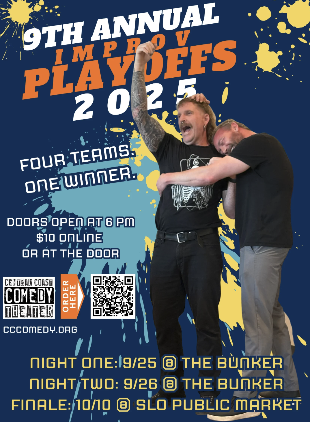 The grand finale show of the 9th annual Improv Playoffs, this show matches up the winners of the first two shows in a heated battle for all the bragging rights (and maybe a trophy). The Improv Playoffs are a much-loved tradition at Central Coast Comedy Theater. Come be a part of the audience deciding who gets crowned the funniest. This is an ARTober featured event, so stop by and grab a free ARTober pouch!