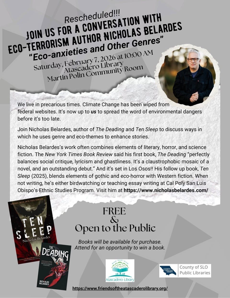 Join local horror author, Nicholas Belardes, for an author talk at the Atascadero Library. The Cove will be selling books, and the library will be giving away 13 FREE copies of Nicholas's books to attendees.