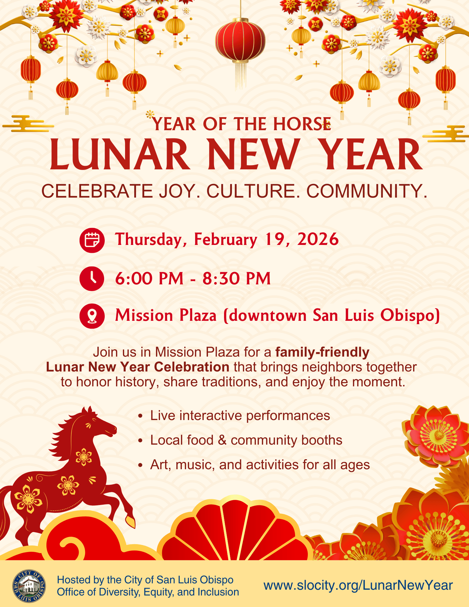 The City’s Lunar New Year Celebration is a family-friendly, community-centered event that honors our shared history while creating space for joy, connection, and cultural appreciation. It is an opportunity for people of all ages and backgrounds to come together, learn from one another, and celebrate the richness that makes San Luis Obispo such a vibrant and welcoming community. This is a moment to slow down, be present, and share in something meaningful as neighbors and friends, whose history and legacy continue to shape our City and this celebration.