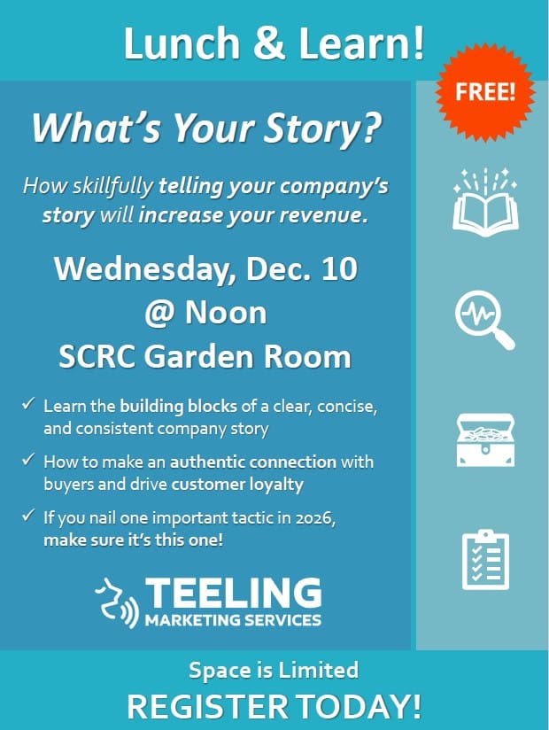 Learn how skillfully telling your company’s story will increase your revenue. At this FREE lunch event, held in the Garden Room at the South County Regional Center, you will hear about the building blocks of a clear, concise, and consistent company story. Making an authentic connection with buyers will drive customer loyalty. If you nail one important marketing tactic in 2026, made sure it's this one!