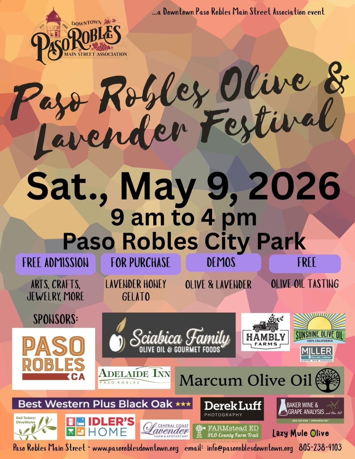 Join us at the annual joint Paso Robles Olive and Lavender Festival on Saturday, May 9, 2026, at the Downtown City Park from 9 am to 4 pm. The Olive Festival is now in its 22nd year and the Lavender Festival started 18 years ago.