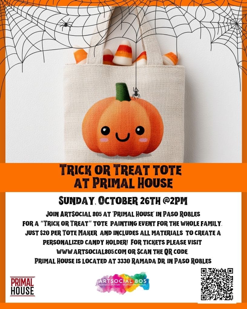 Join ArtSocial 805 at Primal House in Paso Robles for a “Trick or Treat” tote painting event for the whole family. Just $20 per tote maker, and all materials are included to create a personalized candy holder!
