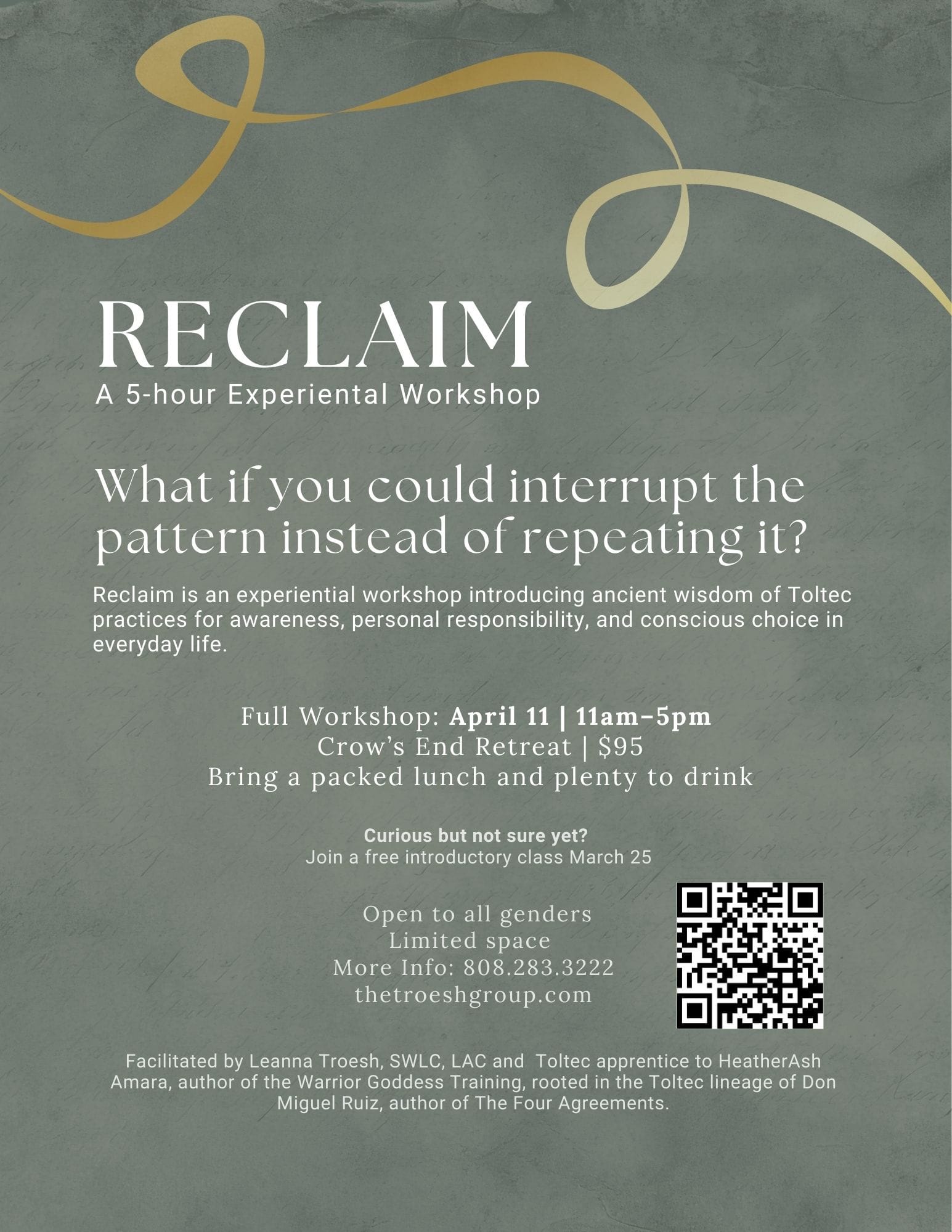 Reclaim is a hands-on experiential workshop focused on awareness, conscious choice, and personal power. Participants will learn practical tools to recognize reactive patterns, clear old emotional residue, and respond with clarity instead of reaction.