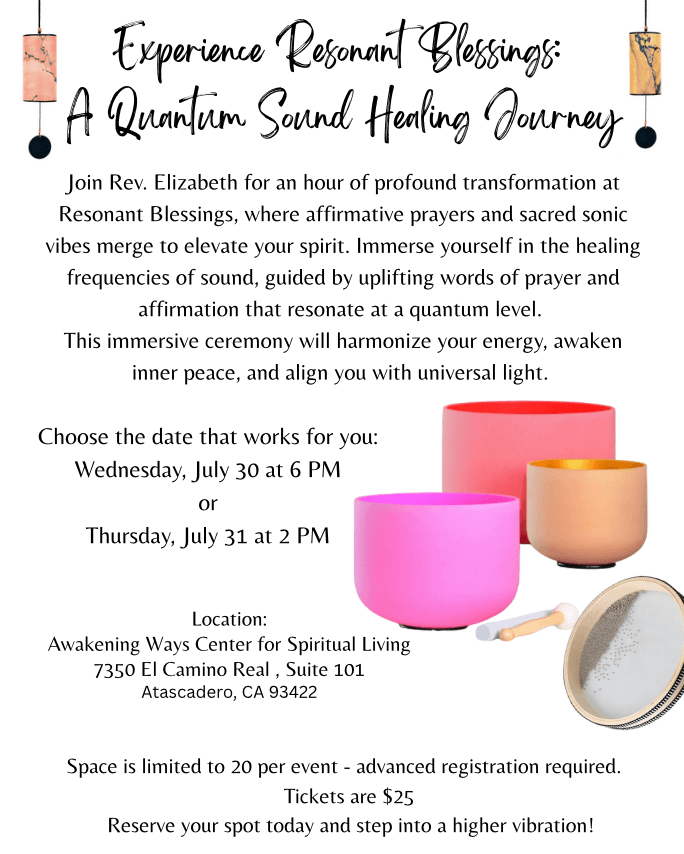 Join Rev. Elizabeth for an hour of profound transformation at Resonant Blessings, where affirmative prayers and sacred sonic vibes merge to elevate your spirit. Immerse yourself in the healing frequencies of sound, guided by uplifting words of affirmation that resonate at a quantum level. This immersive ceremony will harmonize your energy, awaken inner peace, and align you with universal light. Perfect for spiritual seekers and wellness enthusiasts alike.