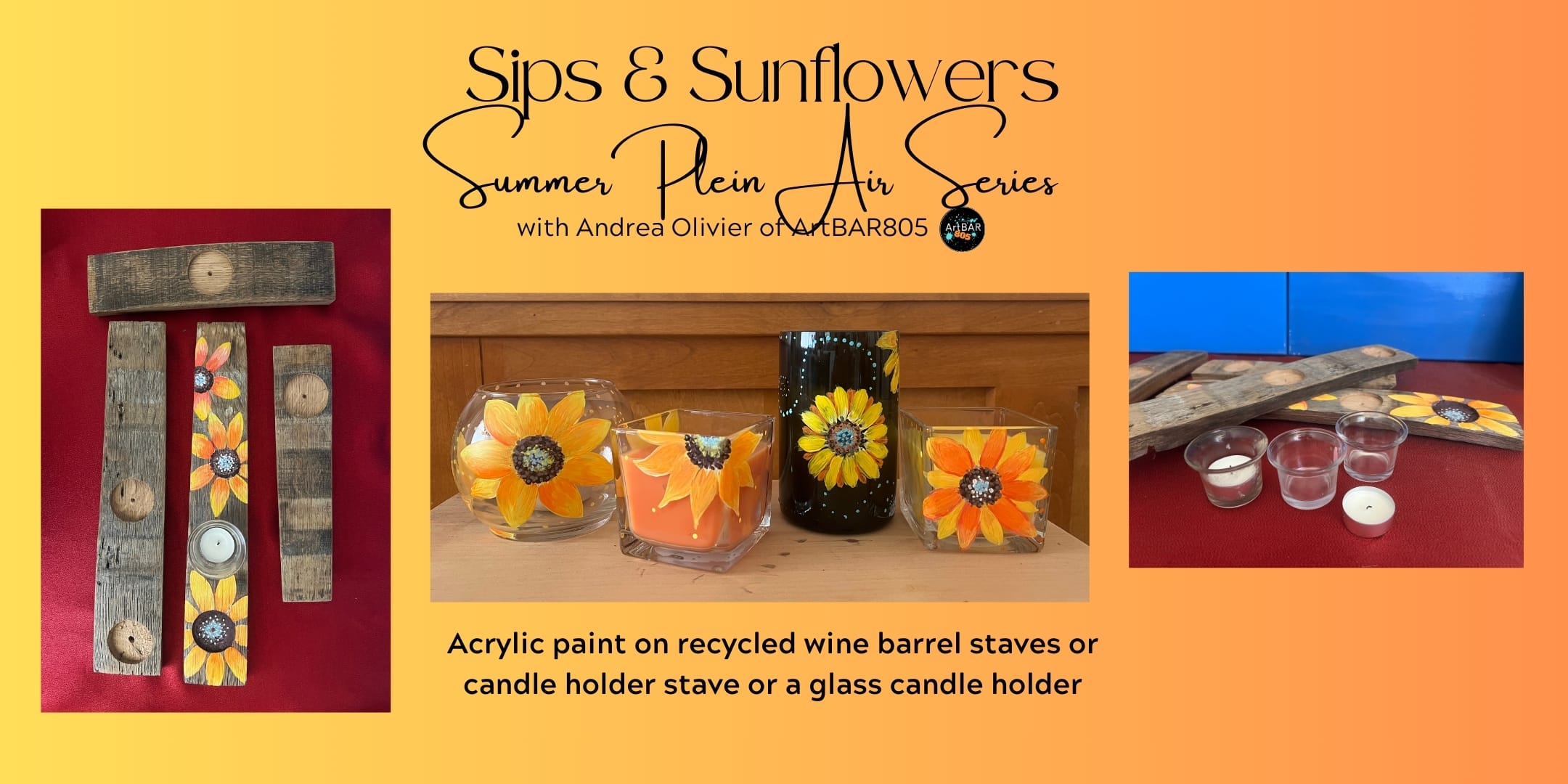 As summer whispers its goodbye, let’s gather under the warm evening light and paint in the open air. Choose your canvas— a weathered wine barrel stave with stories in its grain or a glass candle holder that will glow with your art long after sunset.