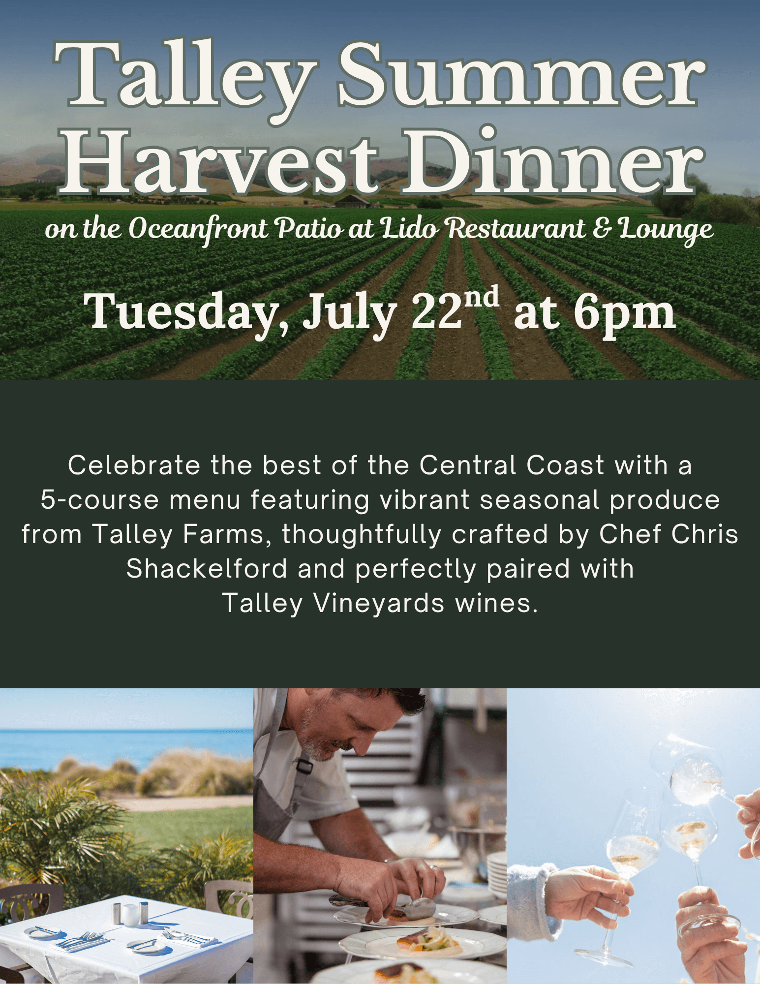 Gather for an unforgettable evening on the oceanfront patio at Lido Restaurant & Lounge, where Talley Farms fresh produce meets the artistry of Chef Chris Shackelfordโs cuisine. This Harvest Dinner will celebrate the best of the Central Coast, pairing the vibrant flavors of Talleyโs seasonal harvest with expertly selected Talley Vineyards wines.