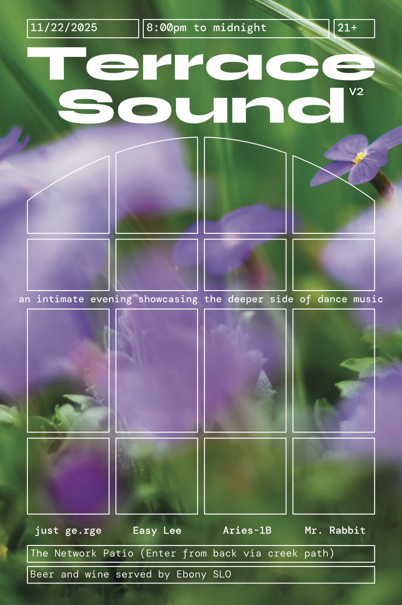 Terrace Sound is a recurring dance event that takes place in Downtown SLO along the SLO Creek Walk. Terrace Sound's focus is to bring deep, underground and classic house music to lovers of authentic dance culture. In its 2nd edition, Terrace Sound returns with a fresh roster of local talent as well as a special guest. Join us for an evening of dancing along SLO creek paired with an immersive projection art experience by the talented Adluminous. You can find more information on our Instagram page @terrace.sound