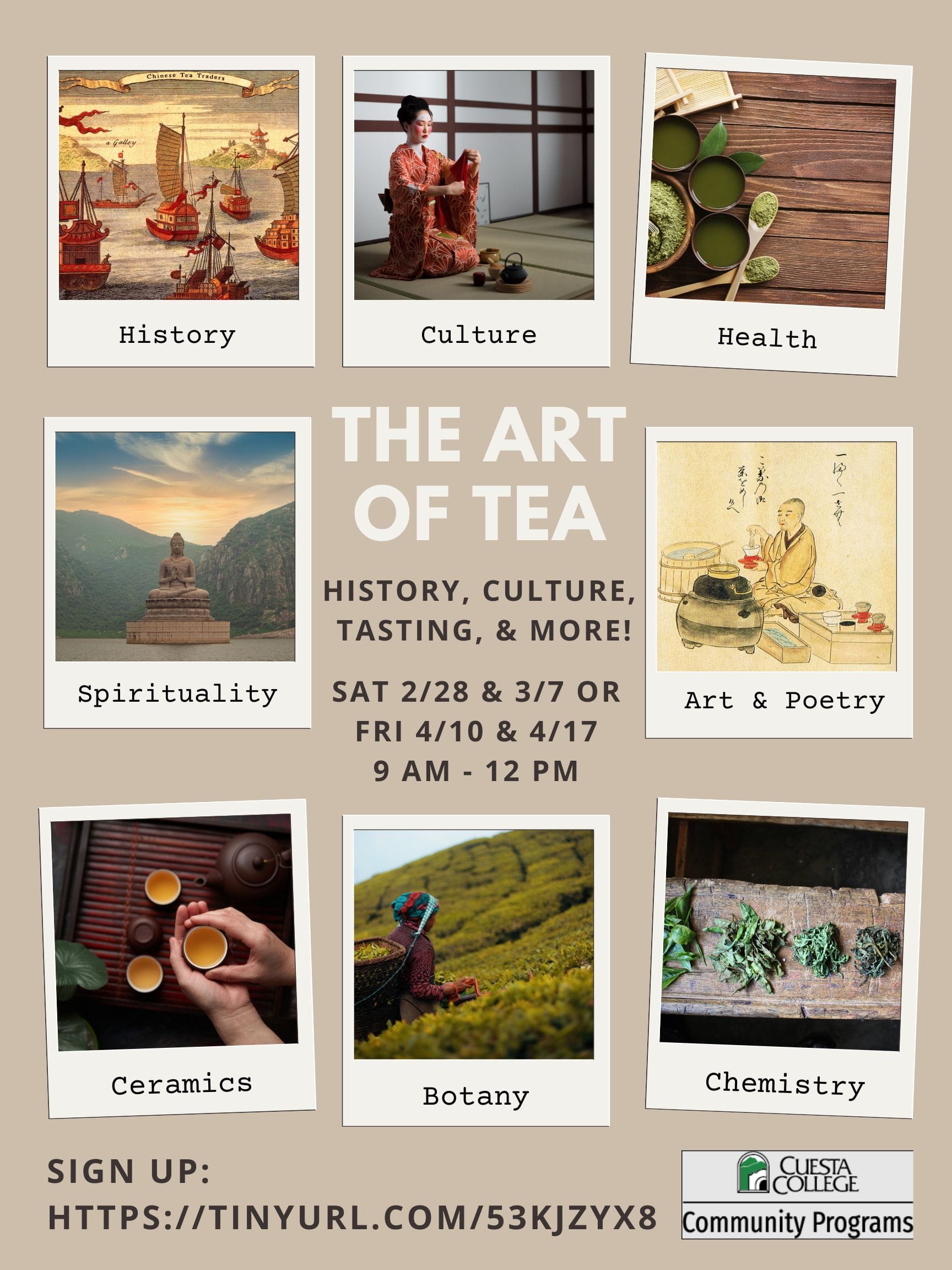 Join us on an informative and illuminating journey to discover tea, the second most consumed beverage in the world after water. The world of tea is vaster and more beautiful than you can imagine…full of history, legend, culture, and mysticism. In this class you will dive into fascinating myths and origin stories, learn to differentiate the 6 main types of tea, get hands-on experience brewing tea with the proper techniques, taste teas from across the globe like a sommelier, and much more.