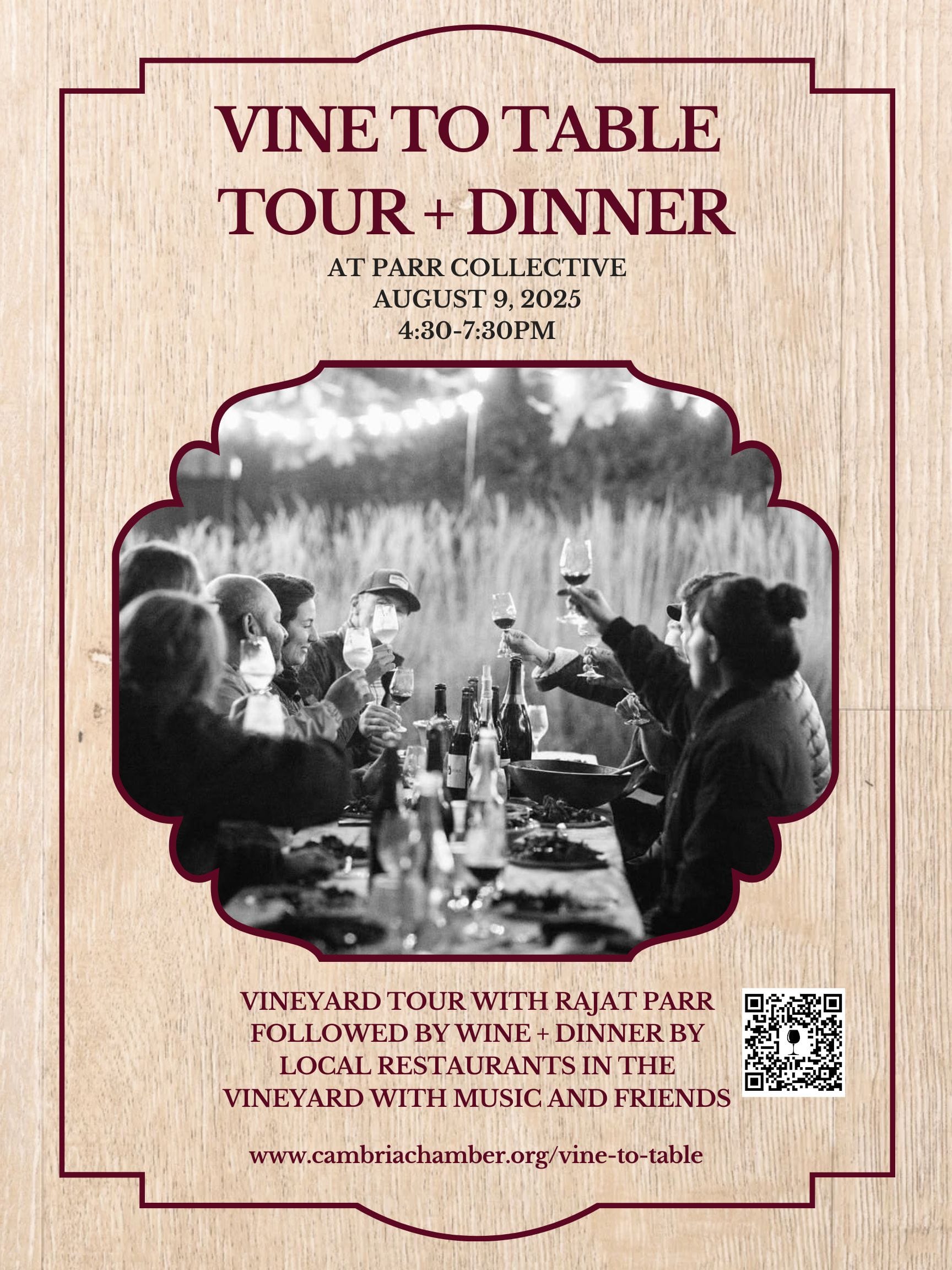 Join us for a magical evening where the vineyard's bounty meets the chef's table. We will start the evening with a personal tour of the vineyard by Rajat Parr, the owner of Parr Collective Winery. Rajat is a Master Sommelier and a James Beard award-winning author, winemaker, and wine director. After the tour you will experience a thoughtfully curated Vine to Table dinner by local restaurants paired with Parr Collective's finest wines, set beneath the open sky among the vines.
