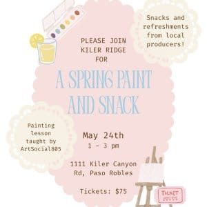 Join us at Kiler Ridge Olive Farm for an elevated Spring Paint & Snack experience on May 24th from 1:00 PM to 3:00 PM. This thoughtfully curated event invites guests to enjoy a guided olive-inspired canvas painting session led by Art Social 805, set against a serene backdrop of our picturesque property. Guests will be...